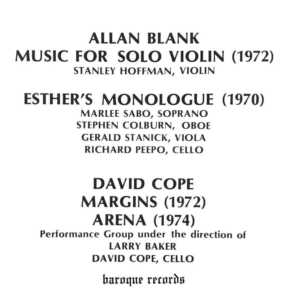 Blank: Music For Solo Violin - Esther's Monologue - Cope: Margins For Trumpet, Cello, Percussion & 2 Pianos - Arena For Cello & Tape