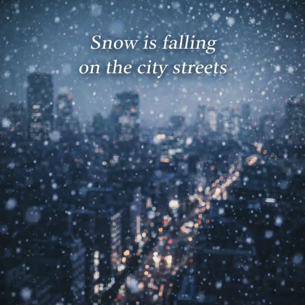 Snow is falling on the city streets