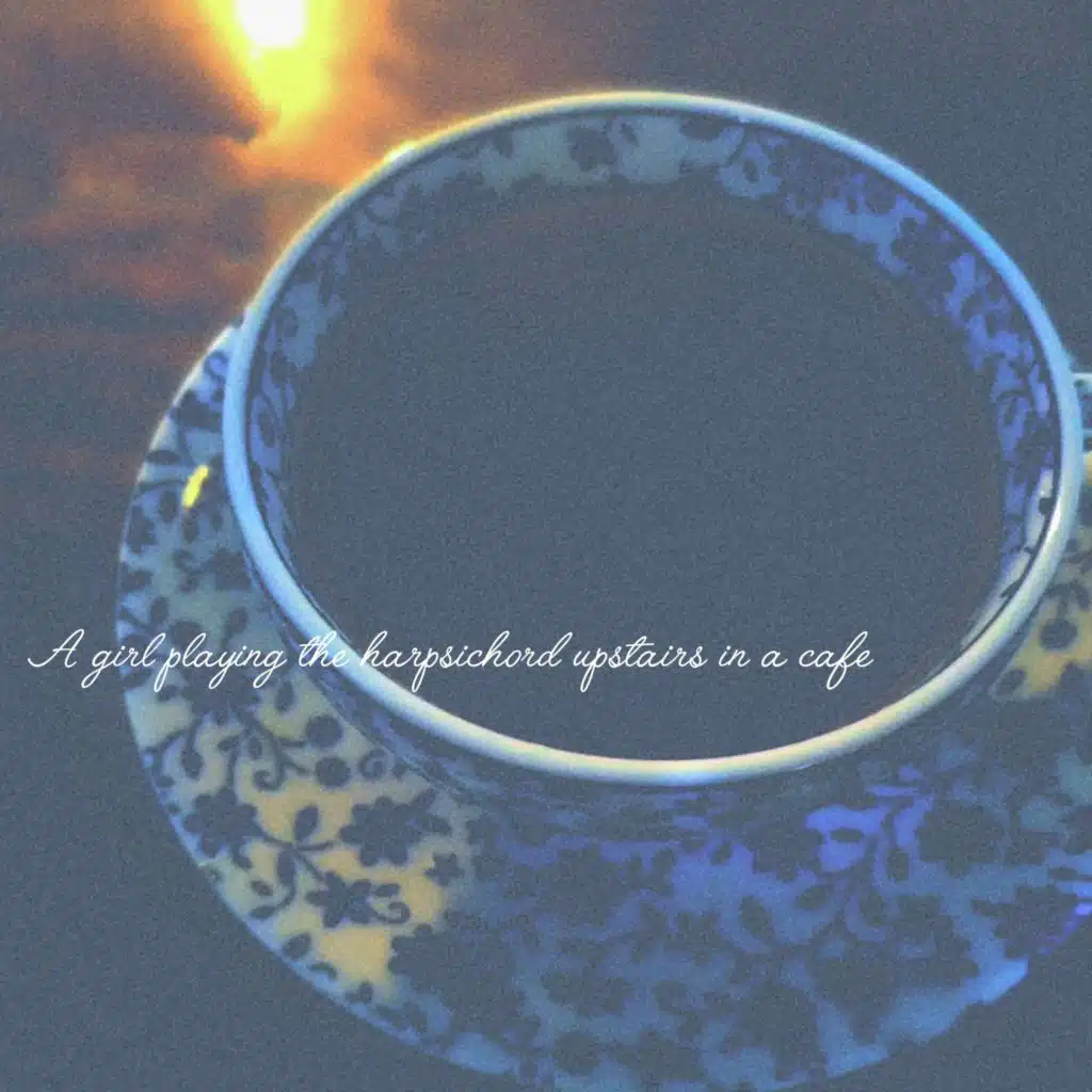 A girl playing the harpsichord upstairs in a cafe