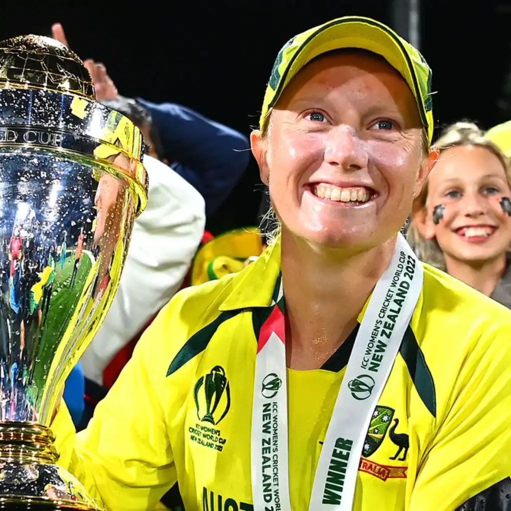 Photo: Alyssa Healy of Australia poses with the World Cup trophy in front of fans after Australia won the 2022 ICC Women's Cricket World Cup Final match between Australia and England in Christchurch, New Zealand. (Credit: Getty Images)