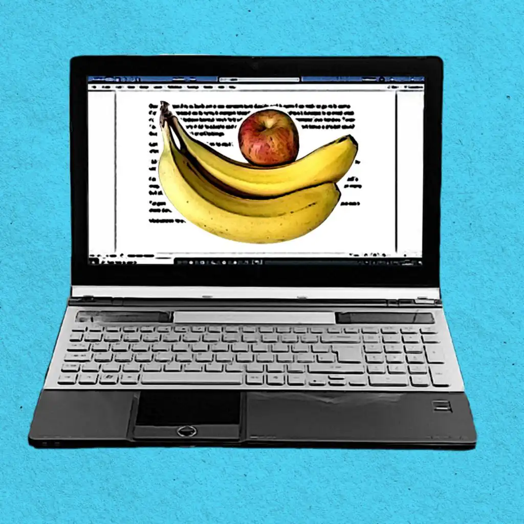(Picture: Image of an apple and two bananas on a laptop screen. Credit: Getty/BBC)