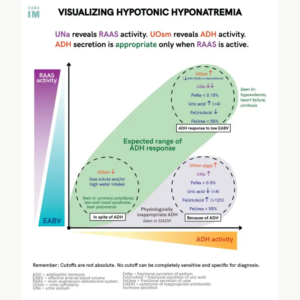 What does each diagnostic test tell you? How do you interpret urine osmolality, urine sodium, or urine urea? What studies can be used to better assess response to treatment? How can uric acid be utilized as a diagnostic tool? What is the interplay between ADH and UOsm?