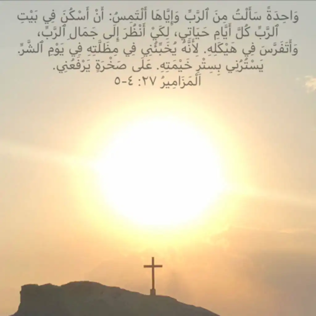 <div dir="rtl">“اَلرَّبُّ نُورِي وَخَلَاصِي ، مِمَّنْ أَخَافُ؟ ٱلرَّبُّ حِصْنُ حَيَاتِي ، مِمَّنْ أَرْتَعِبُ؟ عِنْدَمَا ٱقْتَرَبَ إِلَيَّ ٱلْأَشْرَارُ لِيَأْكُلُوا لَحْمِي ، مُضَايِقِيَّ وَأَعْدَائِي عَثَرُوا وَسَقَطُوا. إِنْ نَزَلَ عَلَيَّ جَيْشٌ لَا يَخَافُ قَلْبِي. إِنْ قَامَتْ عَلَيَّ حَرْبٌ فَفِي ذَلِكَ أَنَا مُطْمَئِنٌّ. وَاحِدَةً سَأَلْتُ مِنَ ٱلرَّبّ ... Show More