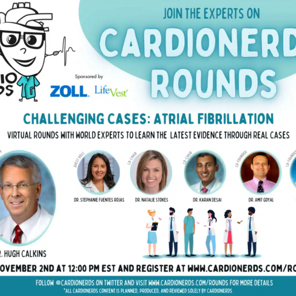 It’s another session of CardioNerds Rounds! In these rounds, Dr. Stephanie Fuentes (EP FIT at Houston Methodist) joins Dr. Hugh Calkins (Professor of Medicine and Director of the Electrophysiology Laboratory and Arrhythmia Service at Johns Hopkins Hospital) to discuss the nuances of atrial fibrillation (AF) management through challenging cases. As an author of several guideline and expert consensus statements in the management of AF and renowned clinician, educator, and researcher, Dr. Calkins gives us many pearls on the management of AF, so don’t miss these #CardsRounds!