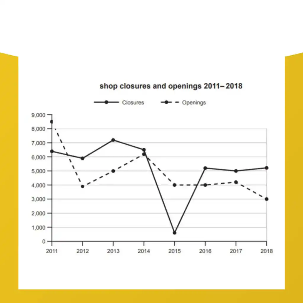 The graph below shows the number of shops that closed and the number of new shops that opened in one country between 2011 and 2018.