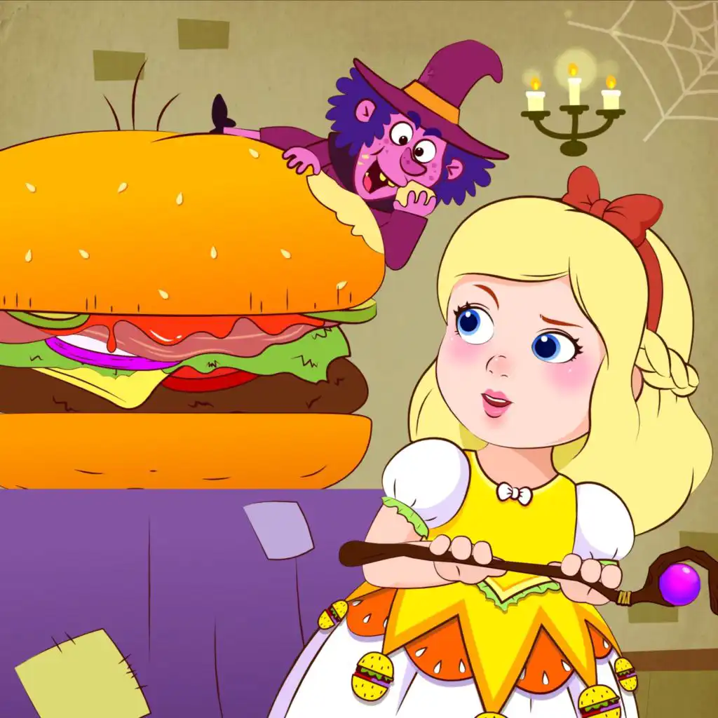 The witch snatched the little girl and named her Burger Princess. Burger Princess was locked away in the kitchen. And she made different burgers for the witch every day.