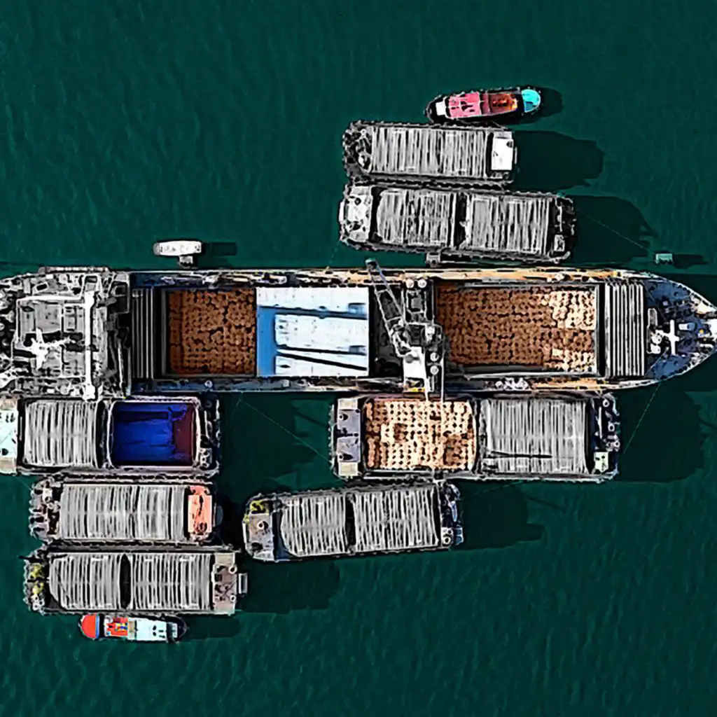 (Image: aerial view of a large ship transporting rice, unloading cargo onto smaller ships. Credit: Getty/BBC)