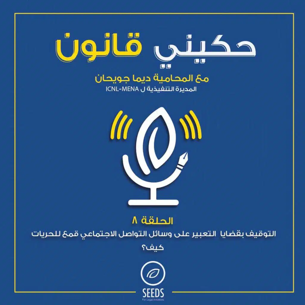 التوقيف بقضايا التعبير على وسائل التواصل الاجتماعي قمع للحريات، كيف؟ بالحلقة الثامنة من بودكاست "حكيني قانون"، منحكي عن التوقيف بقضايا التعبير على وسائل التواصل الاجتماعي واستخدام السلطة لقانون العقوبات لقمع الحريات، مع ضيفتنا المحامية والمديرة التنفيذية ل ICNL-MENA، ديما جويحان.