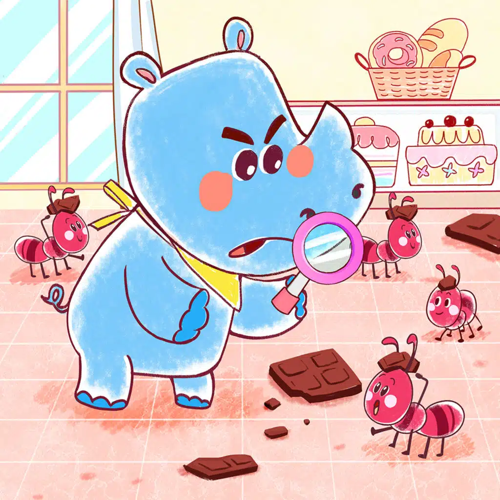 Spotty Dinosaur gave Hasty Rhino a box of chocolate for his help. When Hasty Rhino wakes up the next morning, the box is empty!!!??? Oh no! Who ate all the chocolate? Was it a sneaky mouse? A hungry monkey? A greedy elephant? Let’s put on detective hat and help Hasty Rhino find his yummy chocolate!