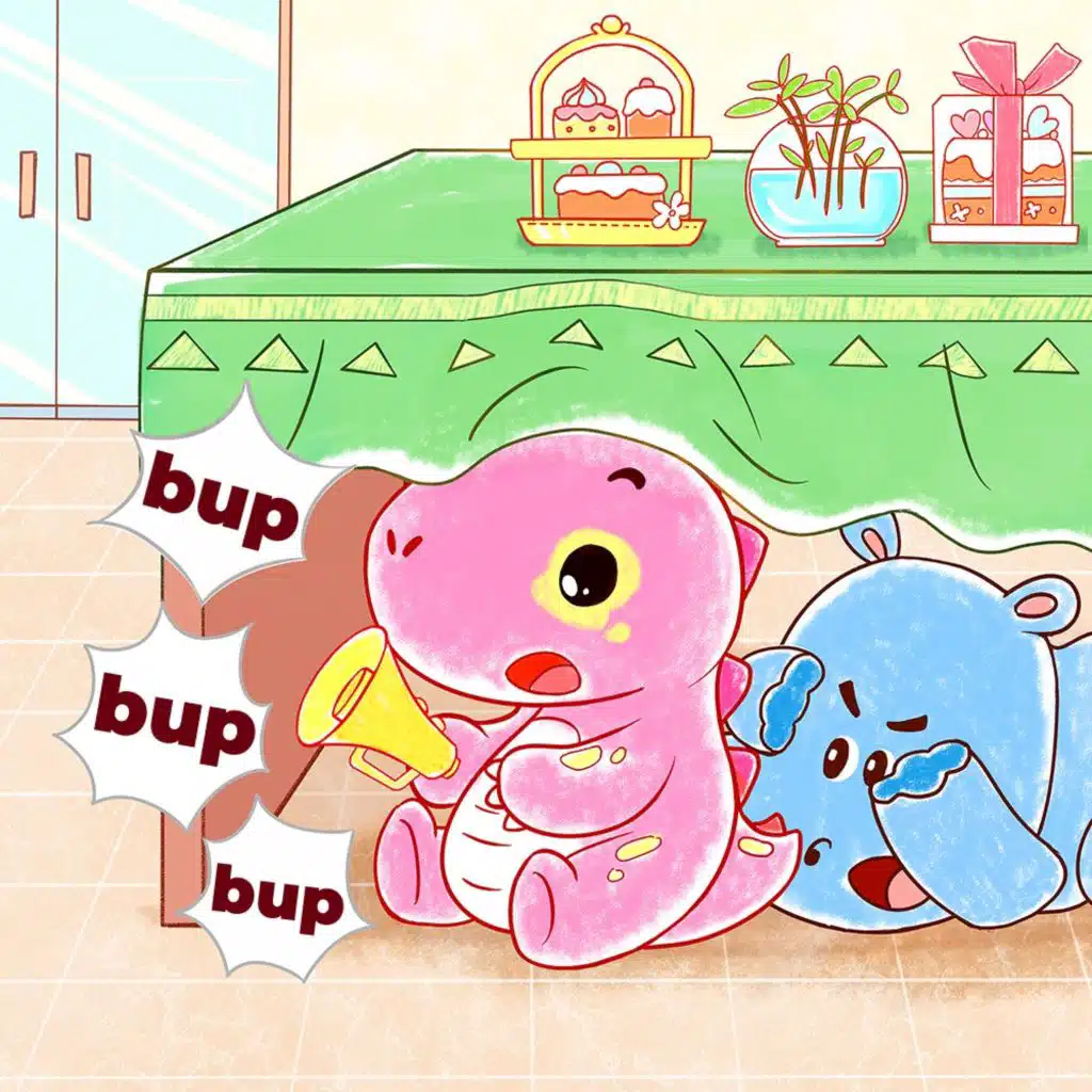 Spotty Dinosaur, Mimi Crocodile and Hasty Rhino are playing game hide-and-seek. But there is a "little leaker"...