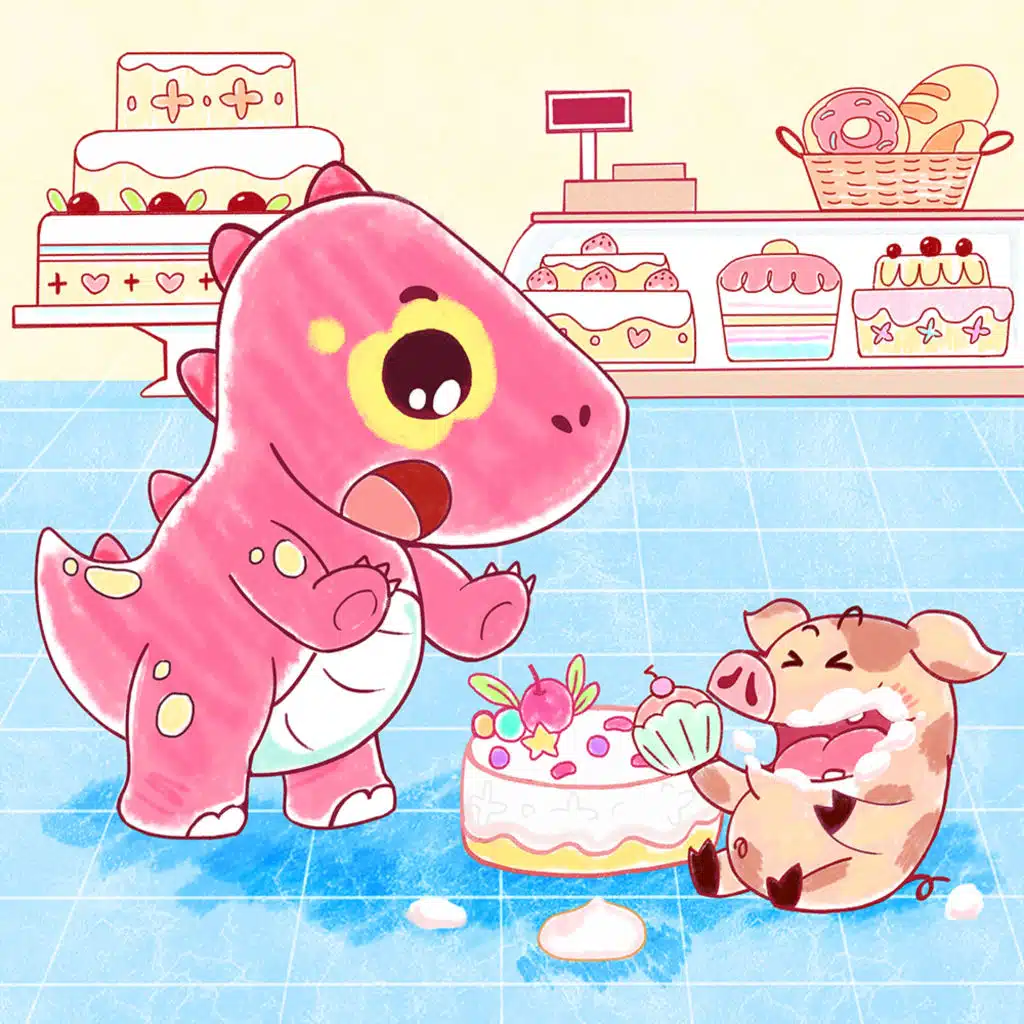 Greedy Piggy stopped in front of Spotty Dinosaur's cake shop. He wanted to live in the cake shop and ate many cakes.