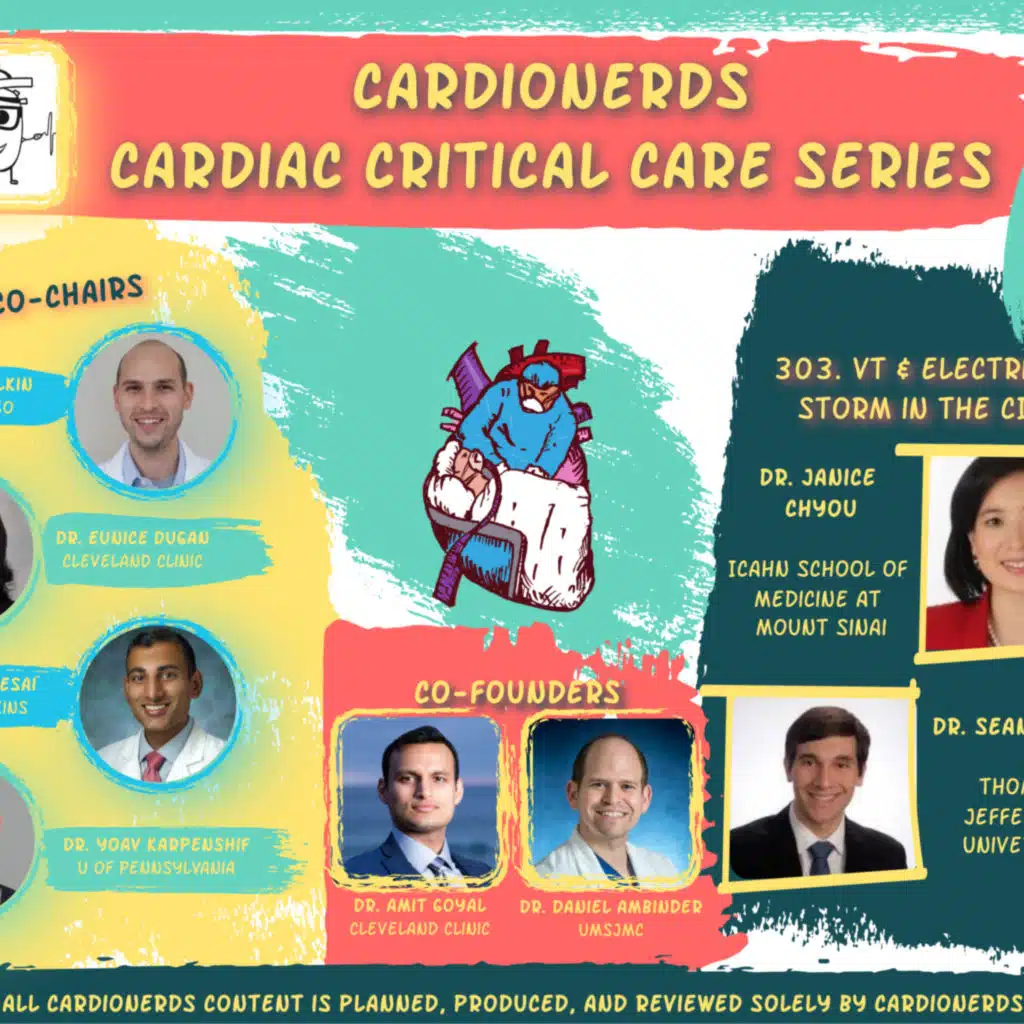 CardioNerds Co-Founder, Dr. Amit Goyal, along with Series Co-Chairs, Dr. Yoav Karpenshif and Dr. Eunice Dugan, and episode Lead, Dr. Sean Dikdan, had the opportunity to expand their knowledge on the topic of ventricular tachycardia and electrical storm from esteemed faculty expert, Dr. Janice Chyou. Audio editing by CardioNerds Academy Intern, Dr. Maryam Barkhordarian.