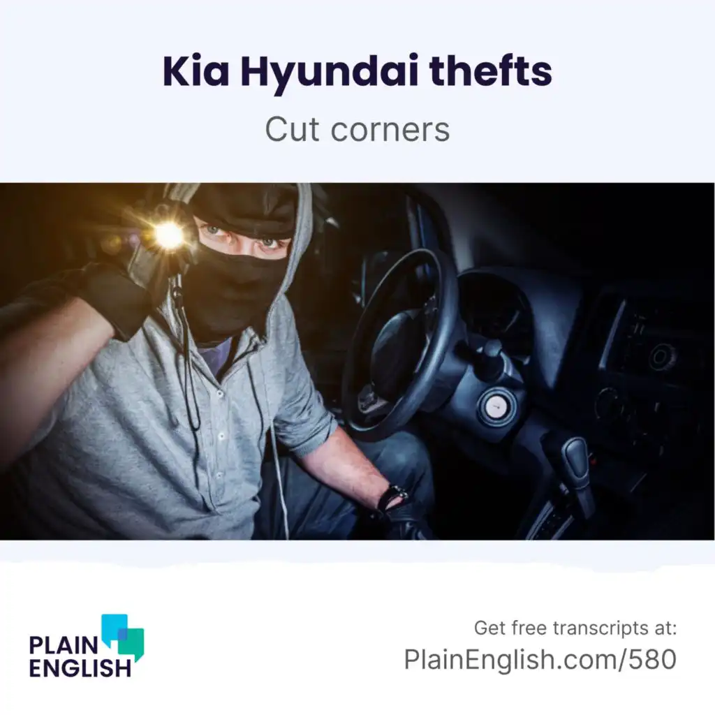 Thefts of Kia and Hyundai cars have plagued American cities after TikTok and YouTube videos showed just how easy it is to steal them. Certain models sold in the U.S. can be stolen in just 30 seconds with a USB cord--and nothing else. It can be traced to one fateful decision by the carmakers. Plus, learn the English expression ""cut corners.""