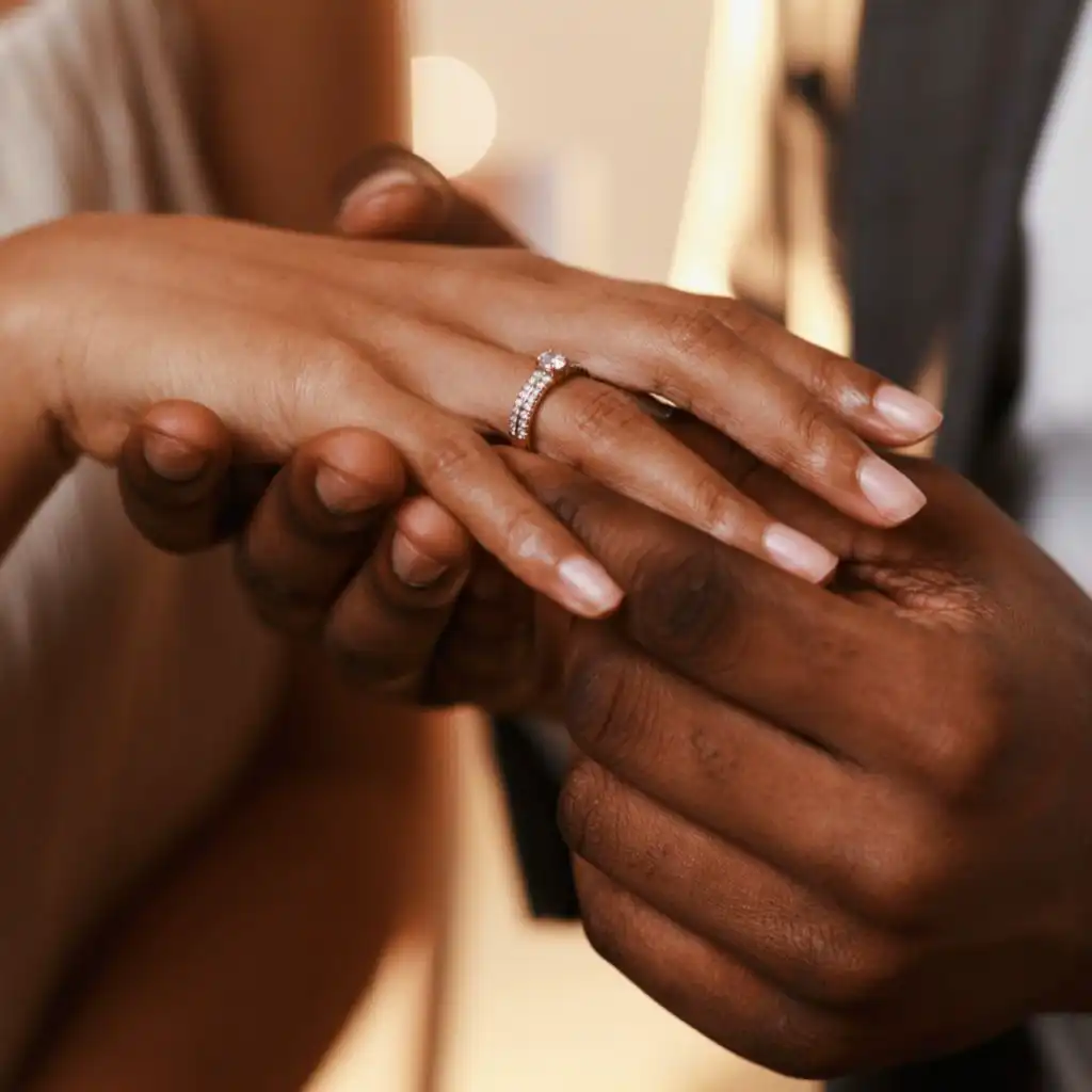 (Picture: Close up of man putting engagement ring on girlfriend. Credit: Getty Images)