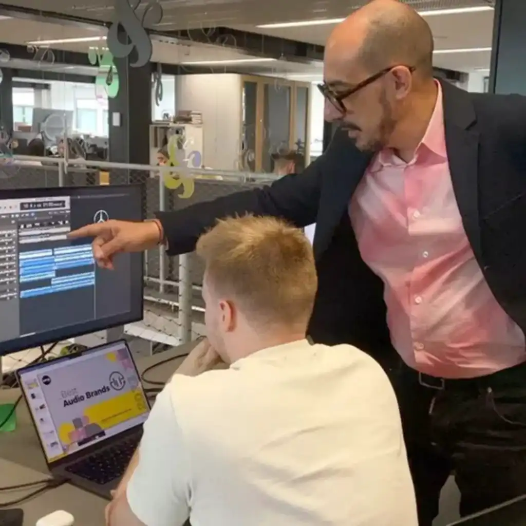 (Picture: Michele Arnese of Amp looking at AI-generated music with a colleague.)