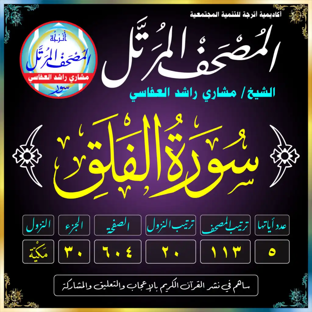 (سُورَةُ الفَلَقِ /مَكيَّة /رَقَمُهَا 113 /عَدَدُ آيَاتِهَا 5 /تَرْتِيبُ النُّزُول 20 /رَقَمُ الصَّفْحَة 604)