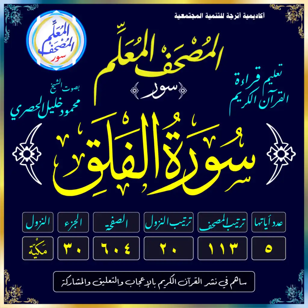 (سُورَةُ الفَلَقِ /مَكيَّة /رَقَمُهَا 113 /عَدَدُ آيَاتِهَا 5 /تَرْتِيبُ النُّزُول 20 /رَقَمُ الصَّفْحَة 604)