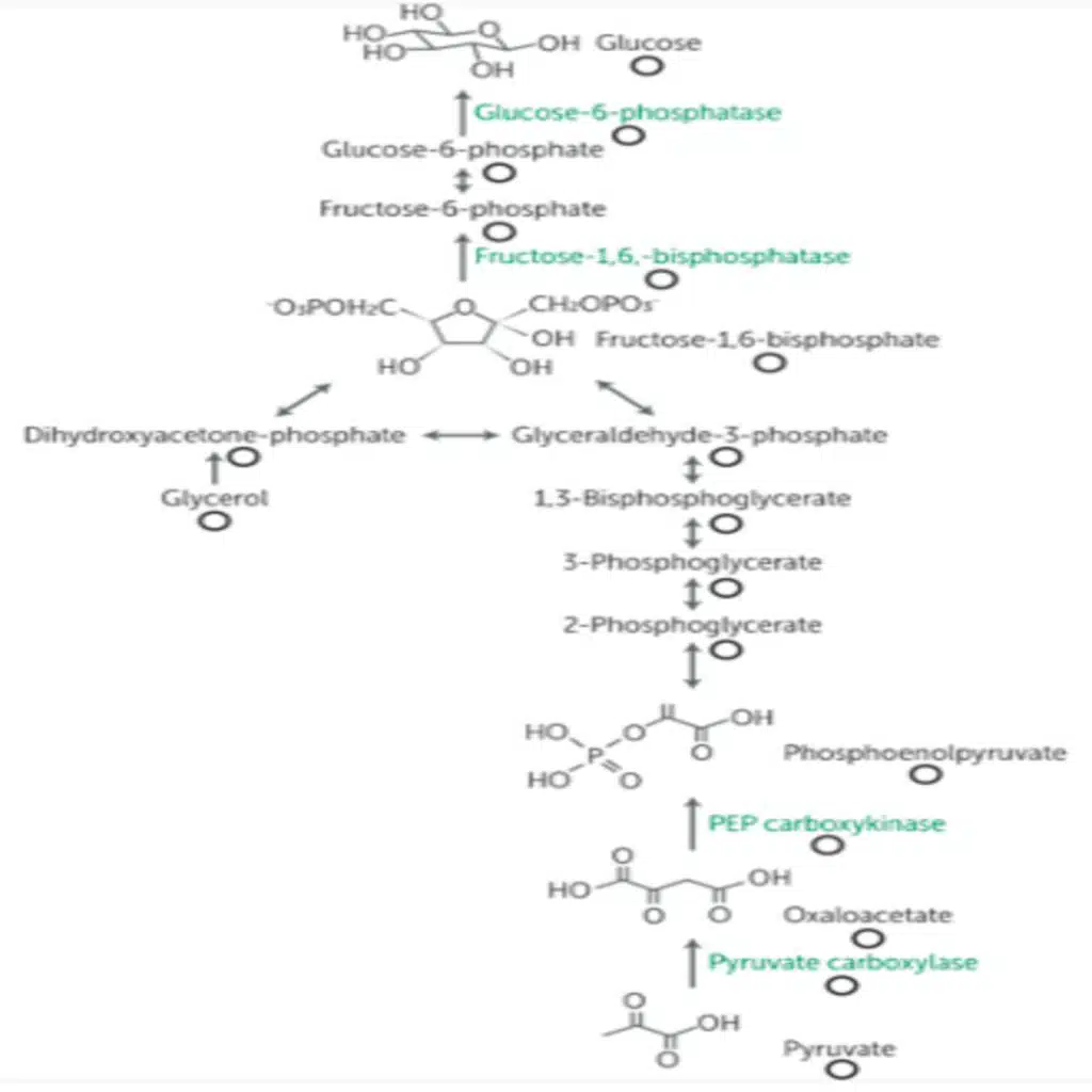 In the fed state, glucose is used by almost all the cells in the body to generate energy. But even when we are not fueling it with food, our bodies still run well, such as during sleep. Gluconeogenesis is the process of synthesizing glucose from noncarbohydrate precursors. The major substrates (substances that enzymes act on) are the glucogenic amino acids, ... Show More