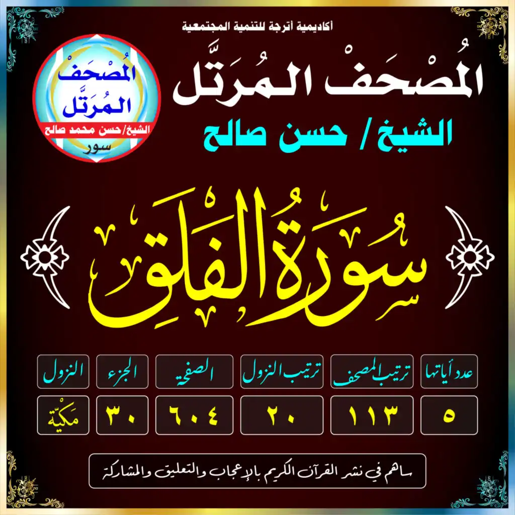 (سُورَةُ الفَلَقِ /مَكيَّة /رَقَمُهَا 113 /عَدَدُ آيَاتِهَا 5 /تَرْتِيبُ النُّزُول 20 /رَقَمُ الصَّفْحَة 604)