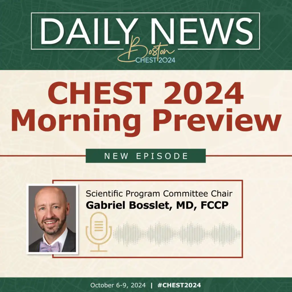 In this episode of CHEST Morning Preview, Gabriel Bosslet, MD, FCCP, Chair of the Scientific Program Committee for CHEST 2024, and CHEST President, Jack D. Buckley, MD, MPH, FCCP, welcome you to CHEST 2024 and give a glimpse into the first day of the meeting, including the Opening Session (8 am ET) and the Keynote Address from Vanessa Kerry, MD, MSc.