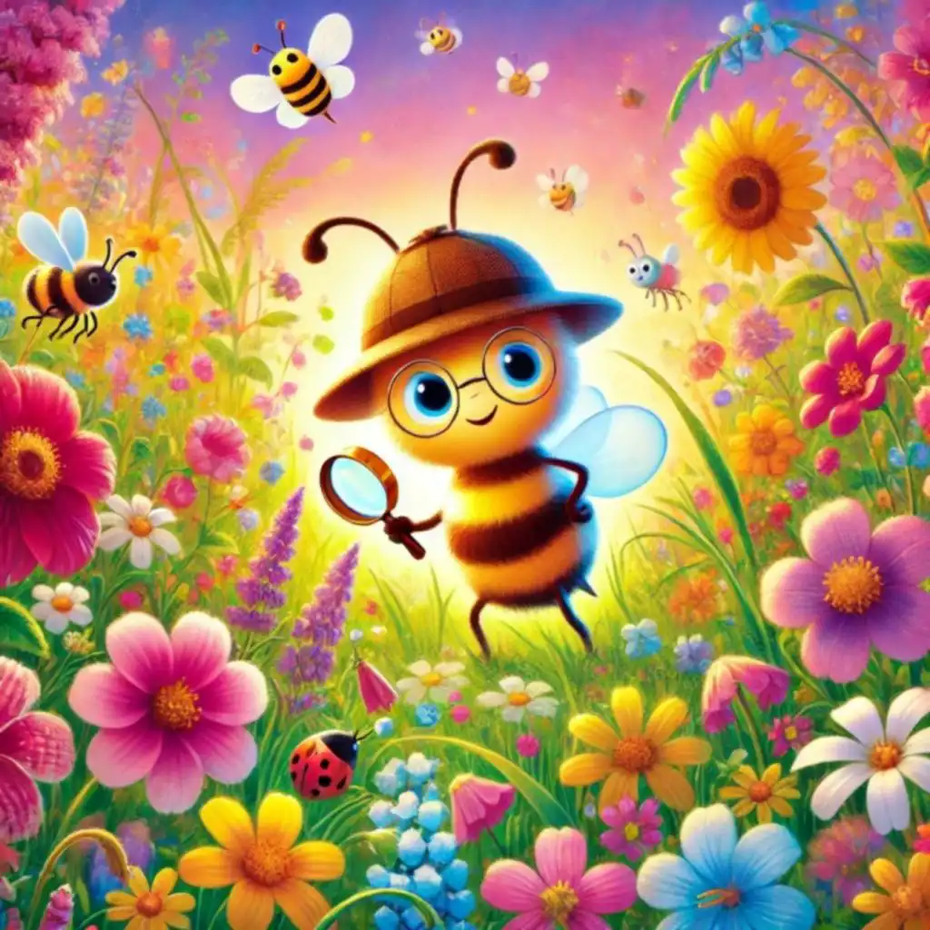 ✨Good evening, little ones! 🐝 In a peaceful meadow filled with flowers and tall grass, lives a clever detective bee who loves solving mysteries with his friends. 🕵️♂️🐝 Today, he went on a curious adventure and learned the importance of teamwork, kindness, and sharing.🌙