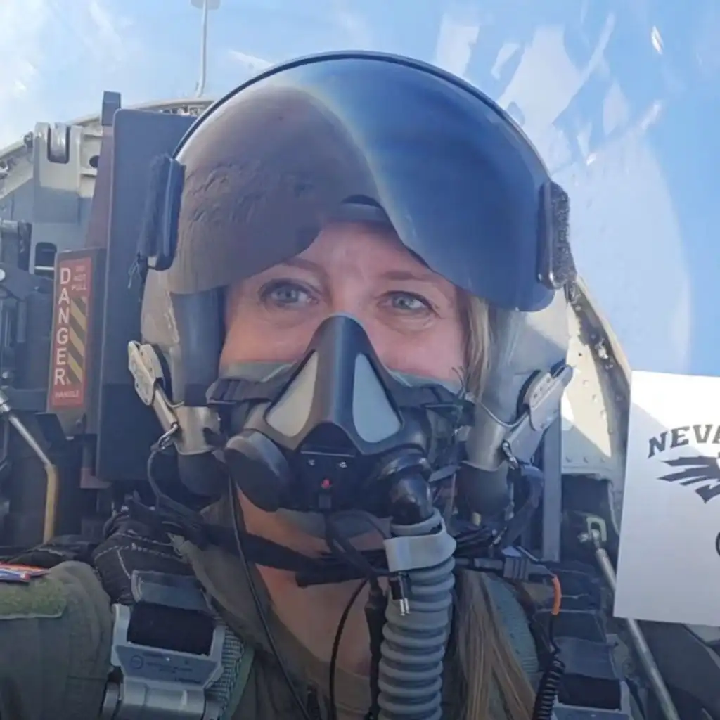 (Image: Ex-US Air Force flight test engineer Jessica Peterson in the back seat of a T-38, taking a selfie video as the plane does an upside down roll. Credit: Getty Images)