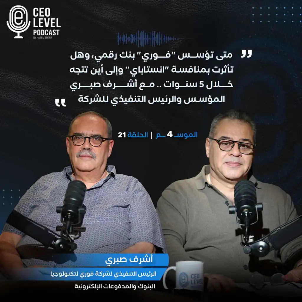 أشرف صبري الرئيس التنفيذي لشركة فوري لتكنولوجيا البنوك والمدفوعات الإلكترونية، ضيفًا على حازم شريف، في أحدث حلقات CEO Level Podcast مساء الأحد. "صبري" يرسم، في الحلقة التي تذاع على قناة ALMAL TV بموقع يوتيوب، وكافة منصات البودكاست والتواصل الاجتماعي، ملامح سباق المنافسة الحالي بين لاعبي تكنولوجيا تحويل الأموال في السوق، ورحلة فوري في الحفاظ على حصتها السوقية الأكبر في سوق المدفوعات. وتحدث "صبري" عن أهمية التكنولوجيا في الإنتاجية وتأثيرها على رفاهية الأفراد، ومستقبل سوق الشركات الناشئة في مصر...