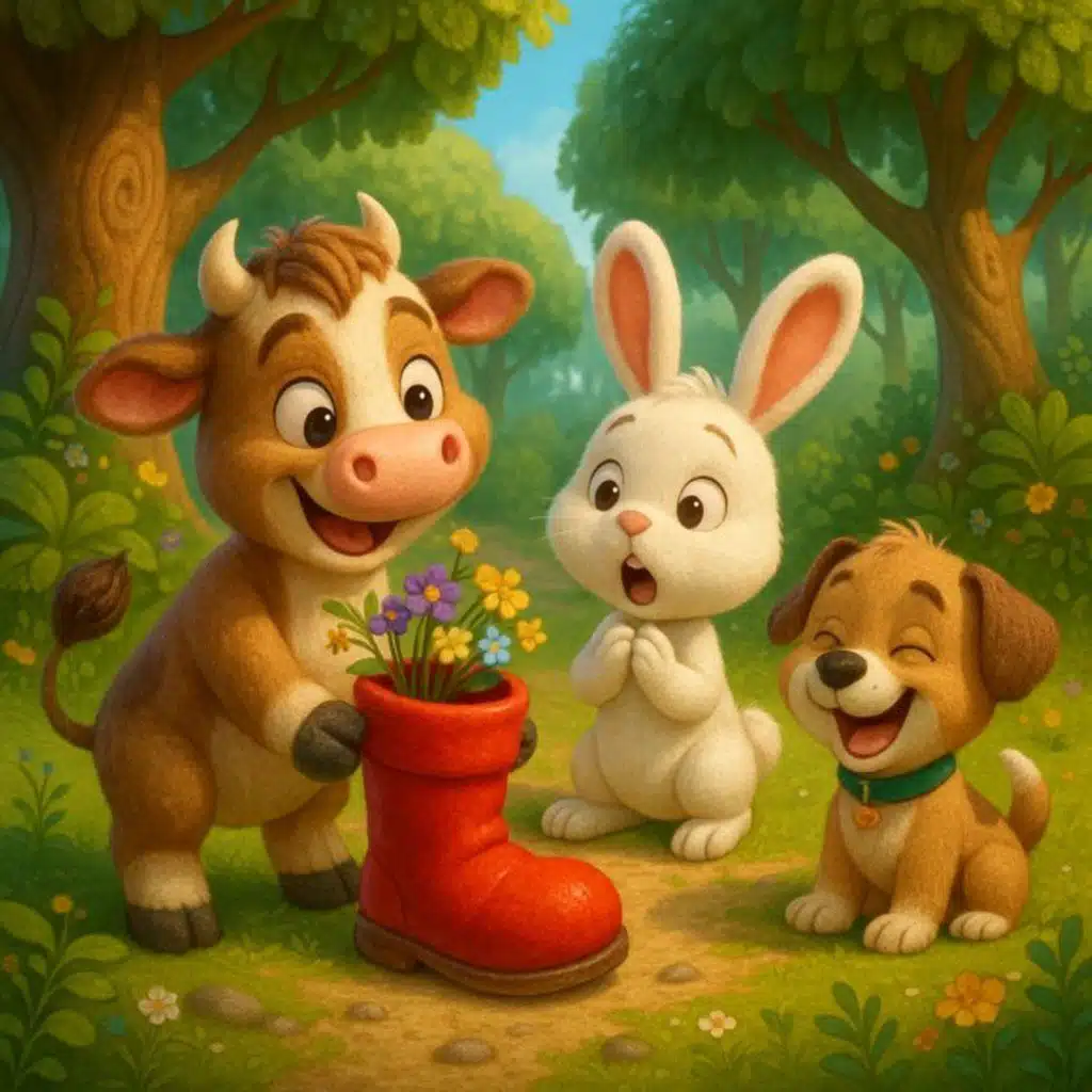 <div dir="rtl">🐮🐰🐶 العجل الصغير وجد شيئًا أحمر عجيبًا في الغابة... لكن ما هو بالضبط؟