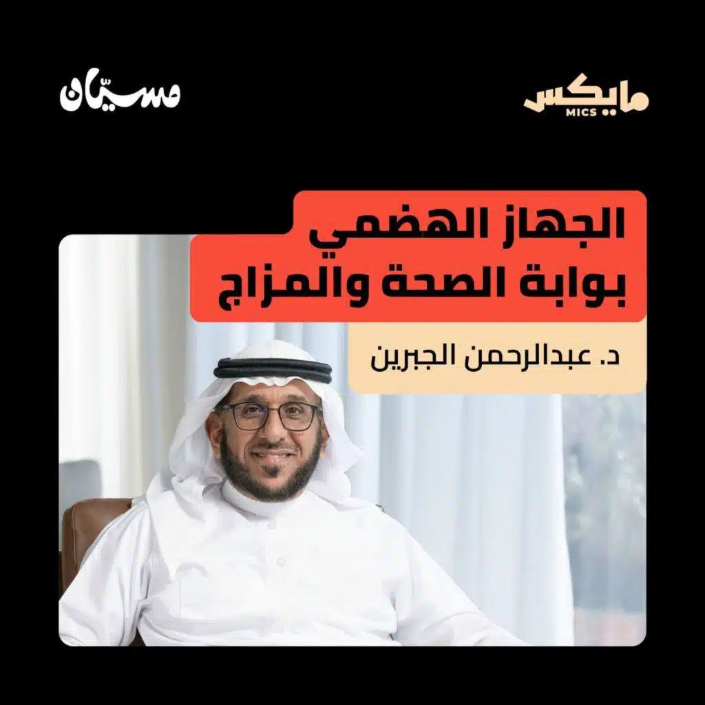 في هذه الحلقة من #بودكاست_مسيان يستضيف عبدالعزيز الهديان د.عبدالرحمن الجبرين استشاري أمراض الجهاز الهضمي والمناظير، في حديث عن صحة الجهاز الهضمي وأكثر أمراضه انتشارًا في مجتمعنا، وإيش ارتباط هذه الأمراض بسلوكياتنا وأسلوب حياتنا؟ وعن التحول الصامت من أمراض المناعة إلى أمراض تبدأ من «الداخل»..