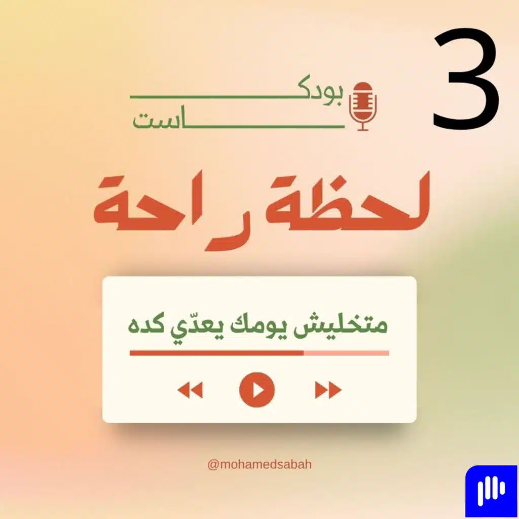 🎙️ لحظة راحة – الحلقة التالتة: متخليش يومك يعدّي كدهأهلاً بيك في حلقة جديدة من بودكاست لحظة راحة.النهارده عايزك توقف لحظة… وتسأل نفسك:“أنا عملت إيه لنفسي النهارده؟”مش قصدي شغل، ولا مهام، ولا واجبات… قصدي لحظة ليك… حتى لو دقيقة