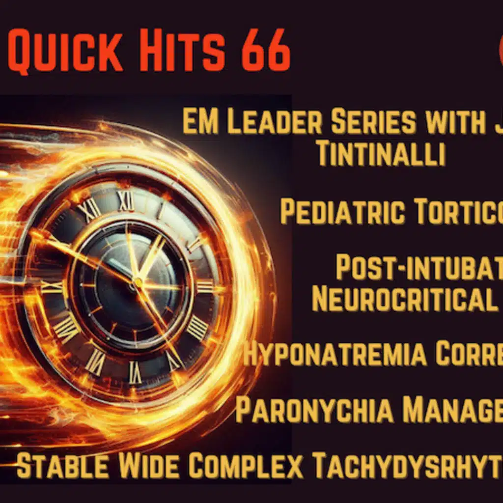 On this EM Quick Hits podcast: Pediatric Torticollis with Dr. Deb Shconfeld, Approach to Stable Wide Complex Tachydysrhythmias with Dr. Anand Swaminathan, Post-intubation Neurocritical Care 5 best practices with Dr. Andrew Petrosoniak, Hyponatremia Correction Rates with Dr. Justin Morgenstern, Paronychia Management with Dr. Andrew Tagg, and Women in EM Leade ... Show More