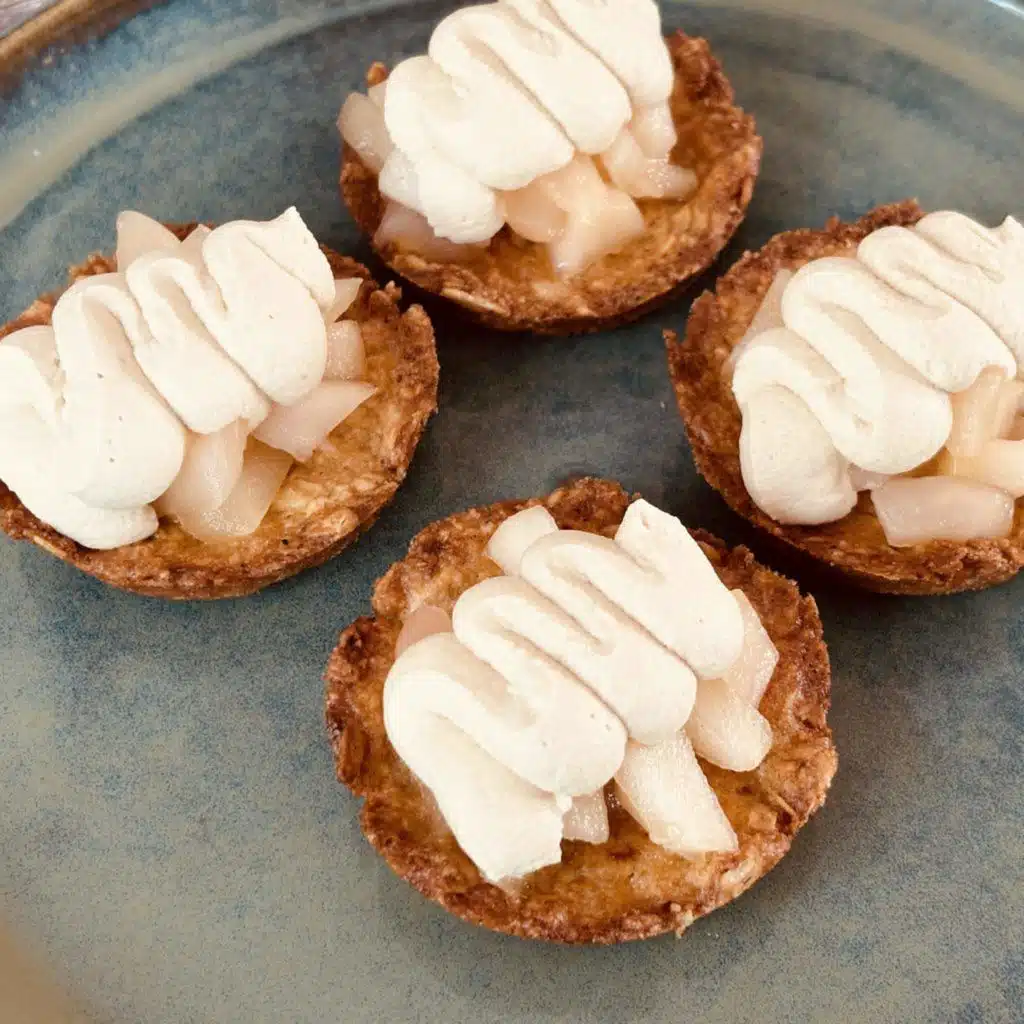 Whip the cream and fold in the sugar and whiskey. Spoon the apple mixture into the oat shells. Pipe or dollop the cream on top.