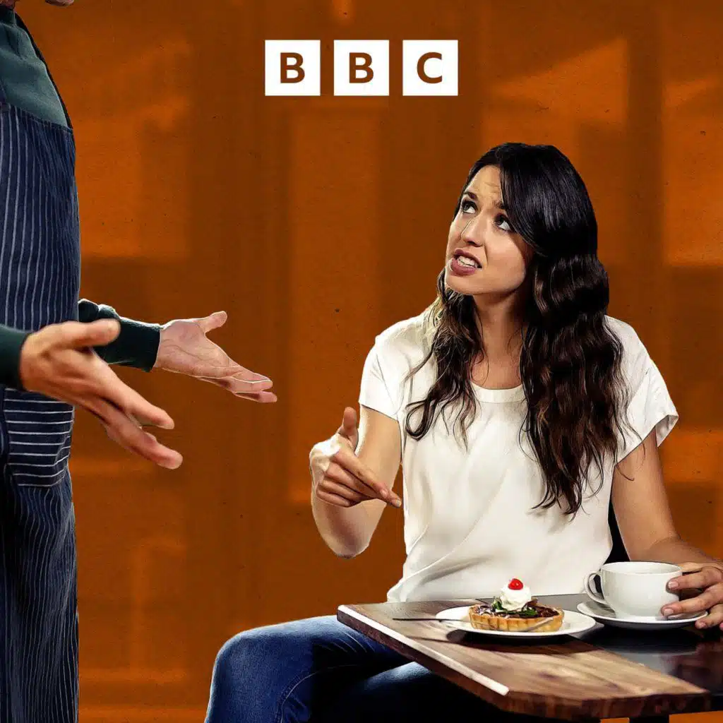 Image: A young woman is arguing with a waiter in a cafe. She has a pastry on her plate and is holding a cup of coffee. Credit: Getty/Wavebreak Media