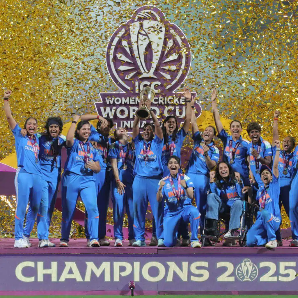Photo: Harmanpreet Kaur of India lifts the ICC Women's Cricket World Cup trophy after her team's victory in the ICC Women's Cricket World Cup India 2025 Final match between India and South Africa at Dr. DY Patil Sports Academy on November 02, 2025 in Navi Mumbai, India. (Photo by Pankaj Nangia/Getty Images)