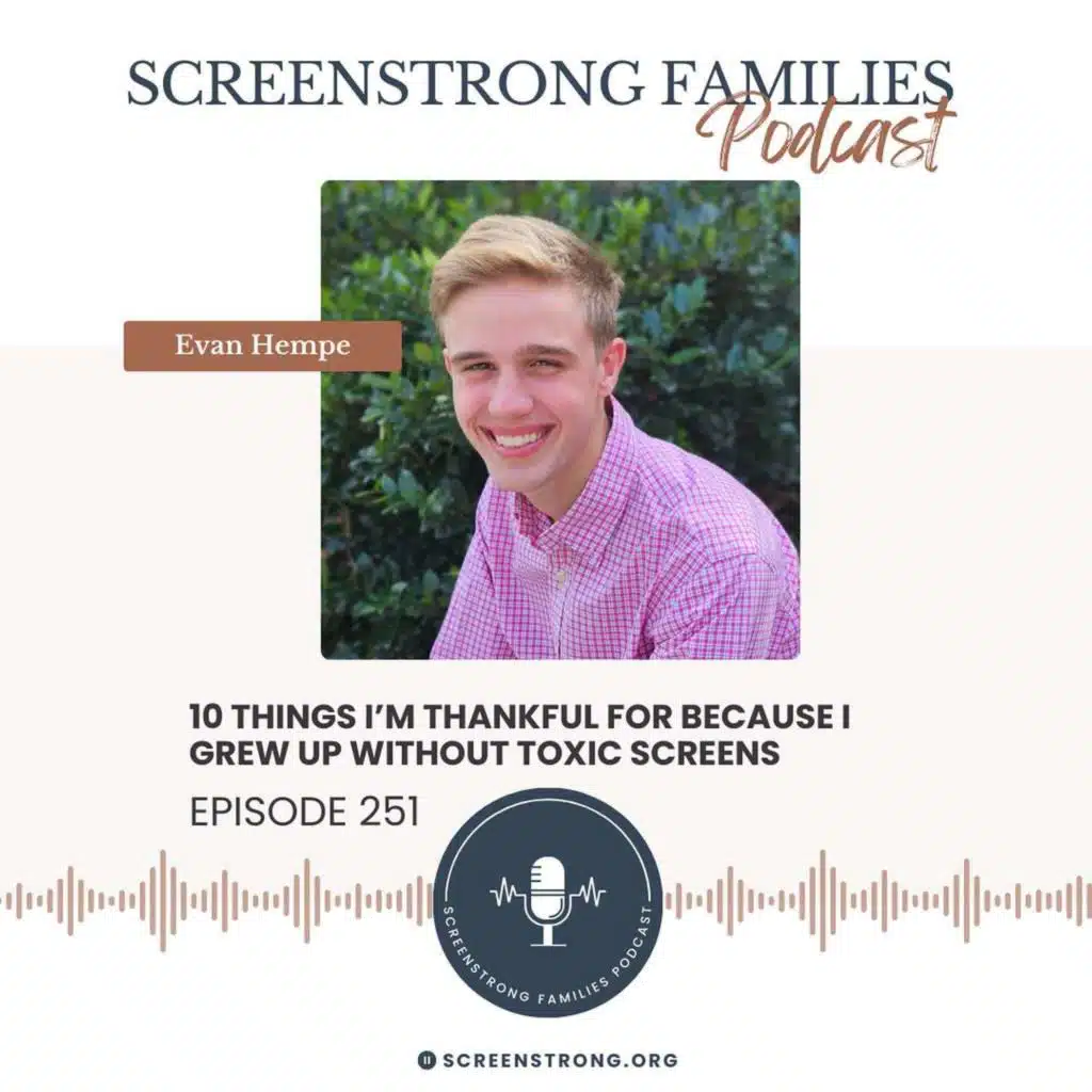 In this special Thanksgiving episode, Evan Hempe steps behind the microphone to share a powerful personal perspective you won’t want to miss. As a young adult looking back on a ScreenStrong childhood, Evan reflects on the unexpected (and sometimes overlooked) gifts that came from growing up without toxic screens. While the culture insists that kids “need” sm ... Show More