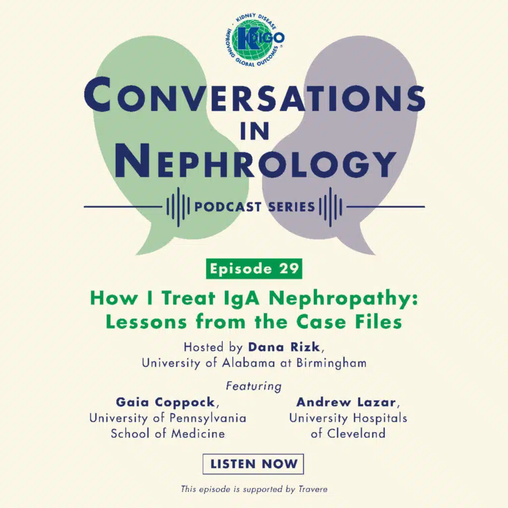 The episode is hosted by Dana Rizk, MD (University of Alabama at Birmingham, US), and features Gaia Coppock, MD (University of Pennsylvania Medicine, US), and Andrew Lazar, MD (University Hospitals of Cleveland, US). Previous episodes in the series feature KDIGO IgAN Guideine Co-Chair Brad Rovin, MD (The Ohio State University College of Medicine, US), and Shikha Wadwani, MD (Cedars-Sinai, US). The fourth and final episode will be released in December 2025 and will focus on the challenges of implementing evidence-based guidance, emerging therapies, and key research needs.