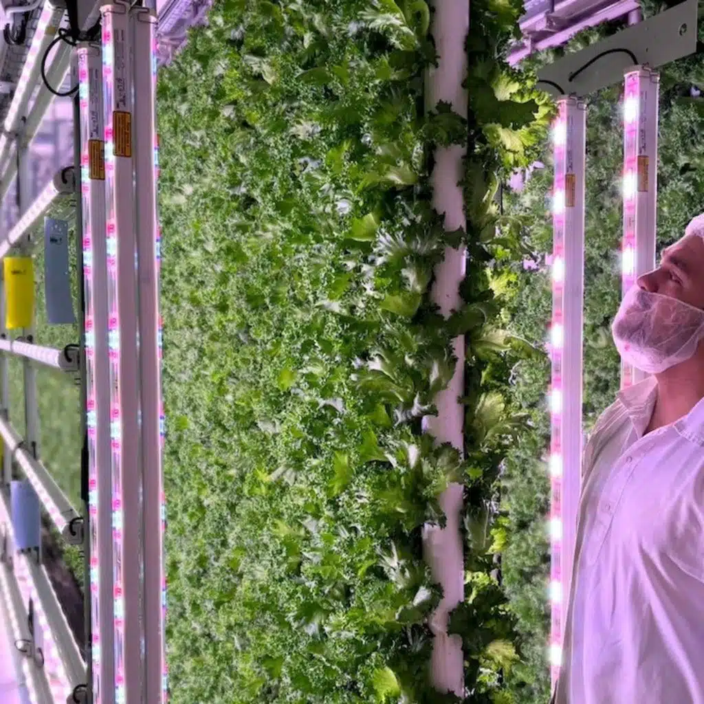 Det är en odling med mycket teknik och automatik. Ett slutet system där allt styrs av olika sensorer. Det som påverkar plantorna kan kontrolleras — klimat, ljusets våglängder och näring. På så sätt kan man styra plantornas storlek, smak, näringsvärde och utseende.