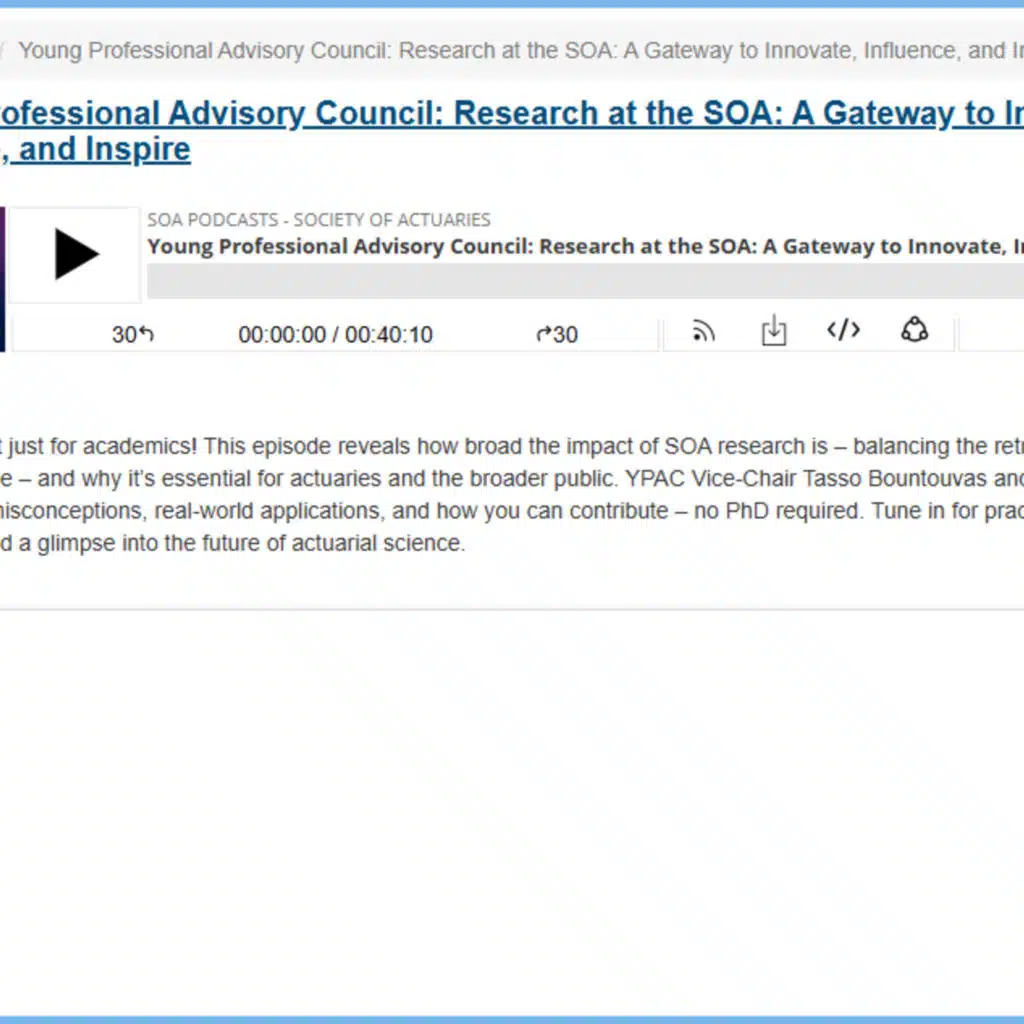 In this episode of Research Insights, we revisit a conversation originally featured in the Young Professional Advisory Council (YPAC) Podcast Series. Host Tasso Buntivas, Vice Chair of YPAC, speaks with Dale Hall, Managing Director of Research at the Society of Actuaries Research Institute.
