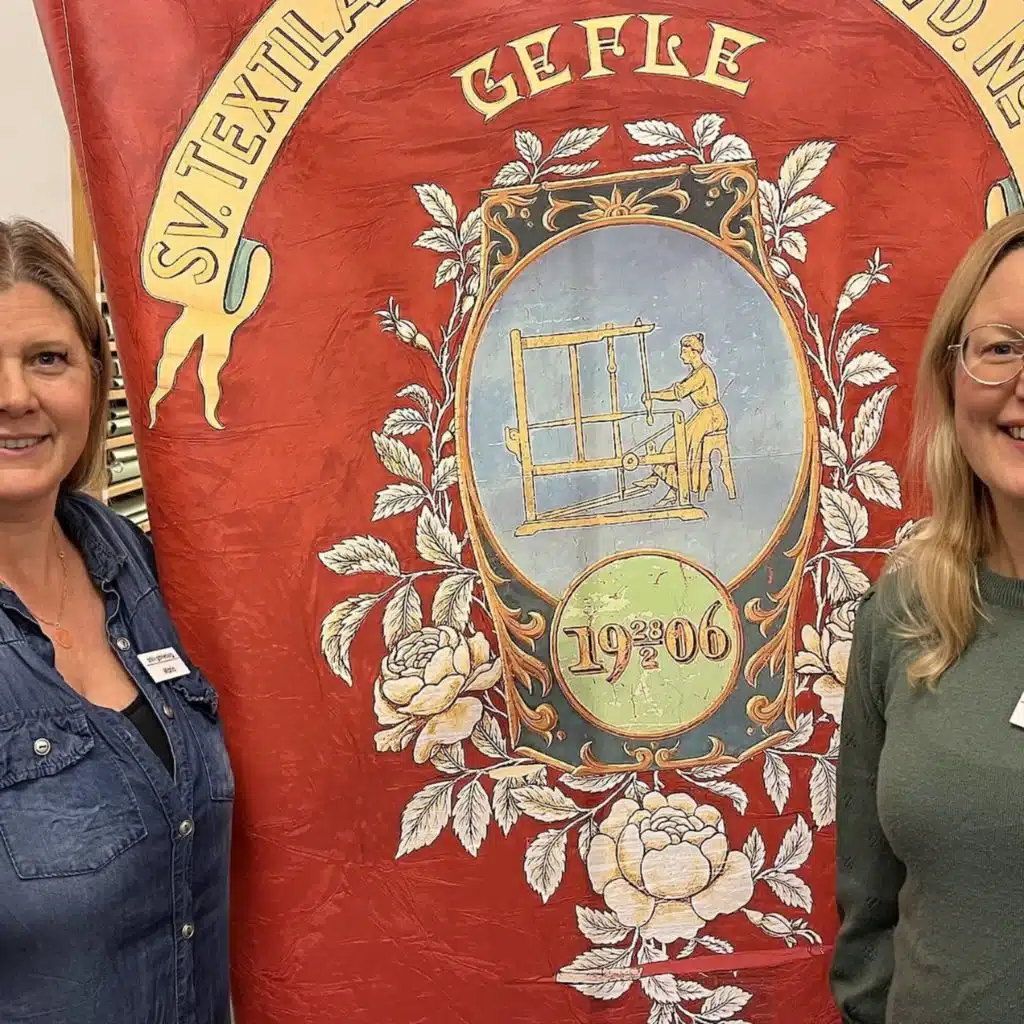 I arkivet finns också föreningslivets symboler: arbetarrörelsens motiv, en textilarbetarfana målad av Ida Mellgren och ett standar från rörelsen för kvinnors politiska rösträtt, där Justitia med vågskålen blir bild av rättvisa och målmedveten organisering. Protokoll från 1916 visar hur material beställdes och broderiet gjordes tillsammans – ett tidsdokument över kollektivt arbete och demokratiska landvinningar.