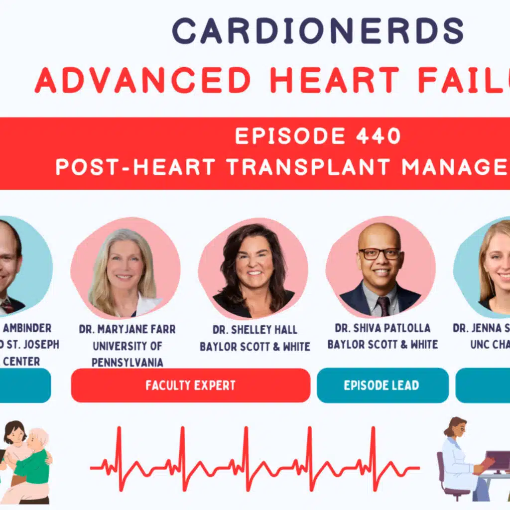 CardioNerds (Dr. Shazli Khan, Dr. Jenna Skowronski, and Dr. Shiva Patlolla) discuss the management of patients post‑heart transplantation with Dr. Shelley Hall from Baylor University Medical Center and Dr. MaryJane Farr from UTSW. In this comprehensive review, we cover the physiology of the transplanted heart, immunosuppression strategies, rejection surveillance, and long-term complications including cardiac allograft vasculopathy (CAV) and malignancy. Audio editing for this episode was performed by CardioNerds intern Dr. Bhavya Shah.