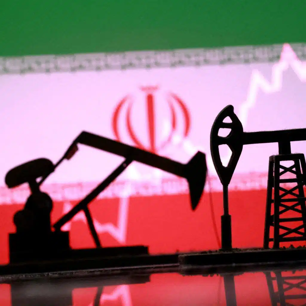 Photo: 3D-printed oil pump jacks, Iranian flag, and a rising stock graph appear in this illustration. Credit: Reuters/Dado Ruvic/Illustration/File Photo