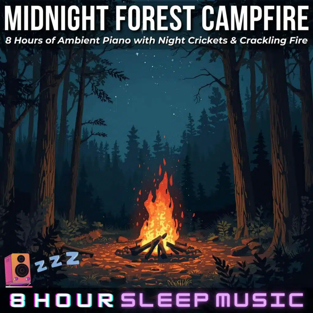 Unwind beneath a canopy of stars with Midnight Forest Campfire, a peaceful soundscape blending ambient piano sleep music, a warm crackling campfire, and the calming nighttime chorus of forest crickets.