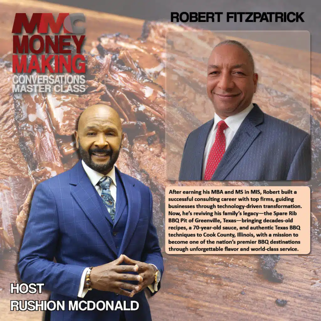 In his interview with Rushion McDonald, Robert Fitzpatrick shares his journey from Navy veteran and Fortune 500 consultant to entrepreneur reviving his family’s historic Texas barbecue. He describes growing up with a courageous father who defied segregation in 1951 by serving Black and white customers together, and a family culture steeped in education, discipline, and humility. Fitzpatrick’s passion for barbecue and encouragement from his wife led him to bring his father’s 70-year-old recipes to Skokie, Illinois through Dewey’s Barbecue Market. The interview emphasizes legacy, faith, courage, and the pursuit of purpose.