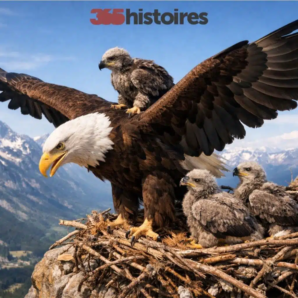 L’aigle les pousse doucement vers le bord du nid.