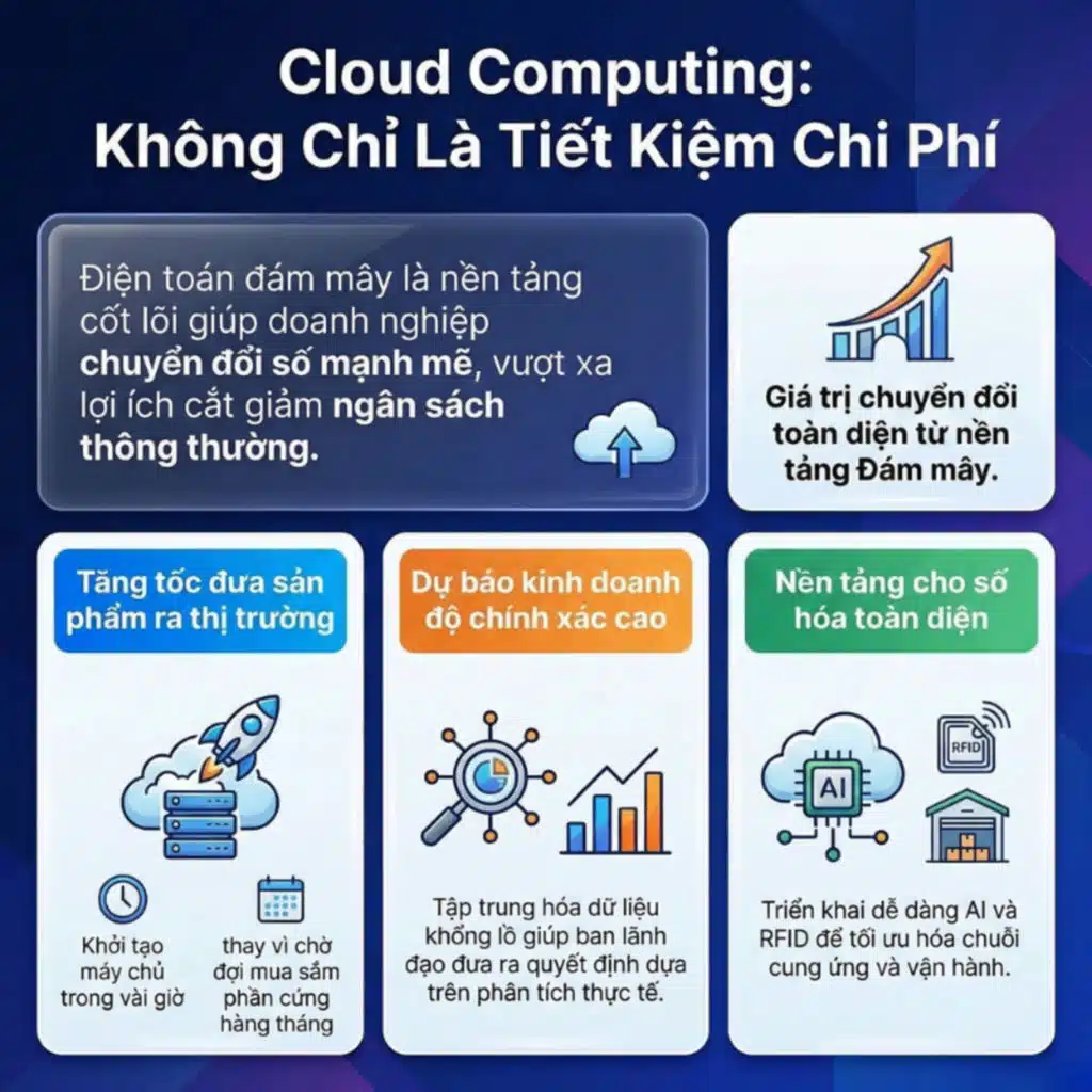 Khi nhắc đến điện toán đám mây (Cloud Computing), yếu tố đầu tiên thu hút các nhà quản trị thường là khả năng cắt giảm ngân sách. Tuy nhiên, đằng sau bề nổi về chi phí, nền tảng đám mây còn mang lại những giá trị chuyển đổi số to lớn hơn thế rất nhiều.