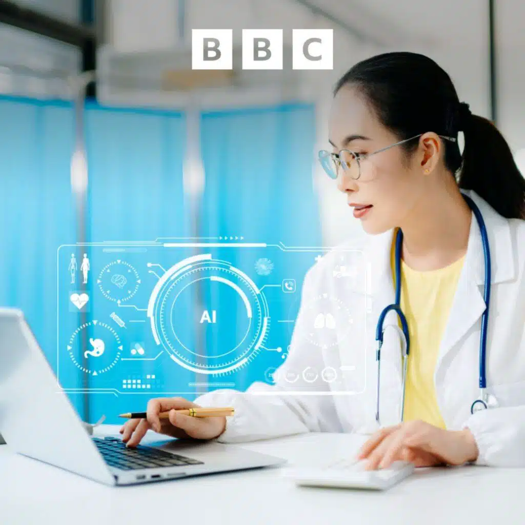 (Image: A photo of a female doctor sitting at a desk in a hospital lab. She is using AI technology on a laptop computer. Credit: Getty Images)