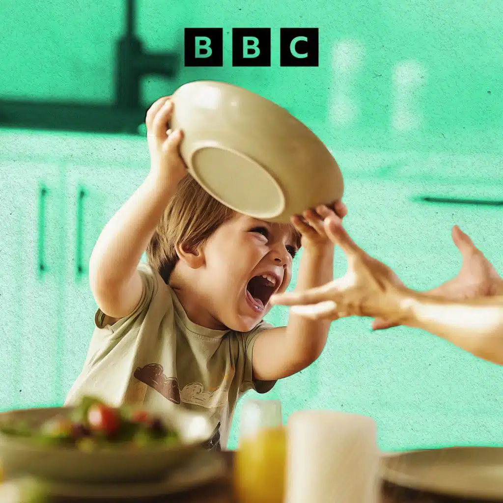 Image: A small angry boy with blonde hair is holding a bowl of food and threatening to tip it on the floor as his parents' hands reach out to stop him. Credit:Getty/ skynesher
