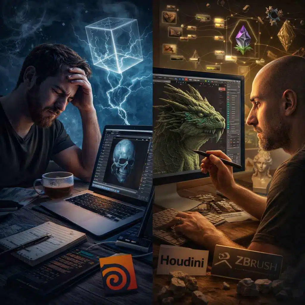 - Houdini as creative rebirth. After nearly burning out on conventional 3D software, Karol discovered that Houdini's node-based, code-driven architecture gave him something the other tools never could — a blank canvas with no ceiling. Rather than navigating a boat someone else built, he now builds the boat from scratch every time, which keeps the work perpetually challenging and alive.