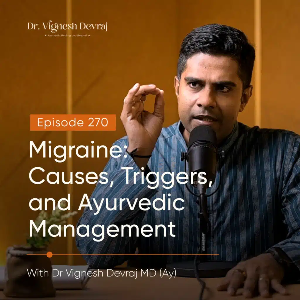 In this episode, Dr. Vignesh Devraj breaks down why migraine is not just a headache and why simply escaping triggers or taking painkillers isn’t enough. From inflammation to the surprising link between gut health and migraines, this episode connects modern science with Ayurvedic insight. You’ll discover how sleep, stress, digestion, and daily routine quietly shape your migraine patterns and why Ayurveda sees it as a deeper imbalance of Vata and Pitta, not an isolated issue.