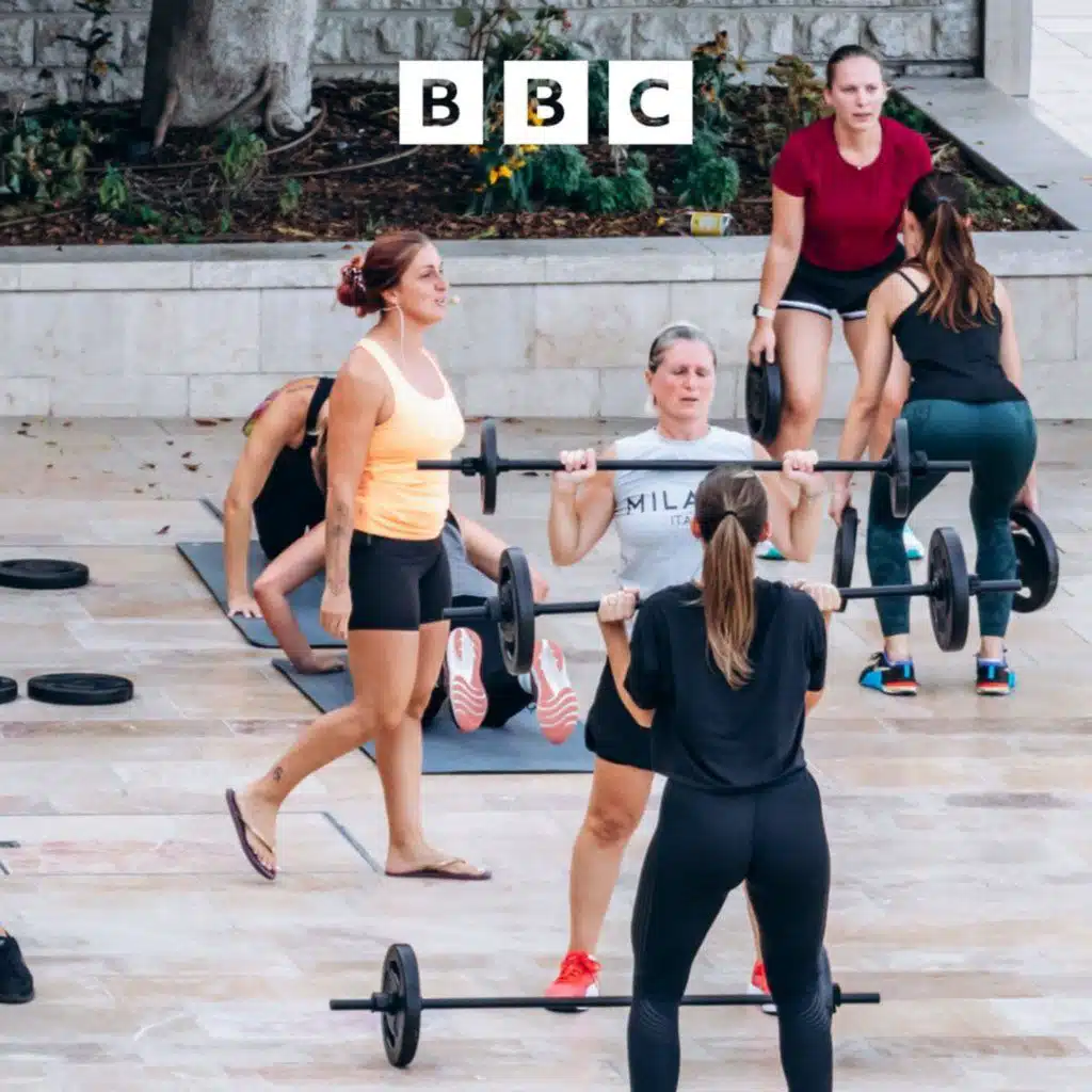 (Picture: People taking part in an outdoor fitness workout with barbells and step platforms on the French Riviera. Credit: Getty Images)